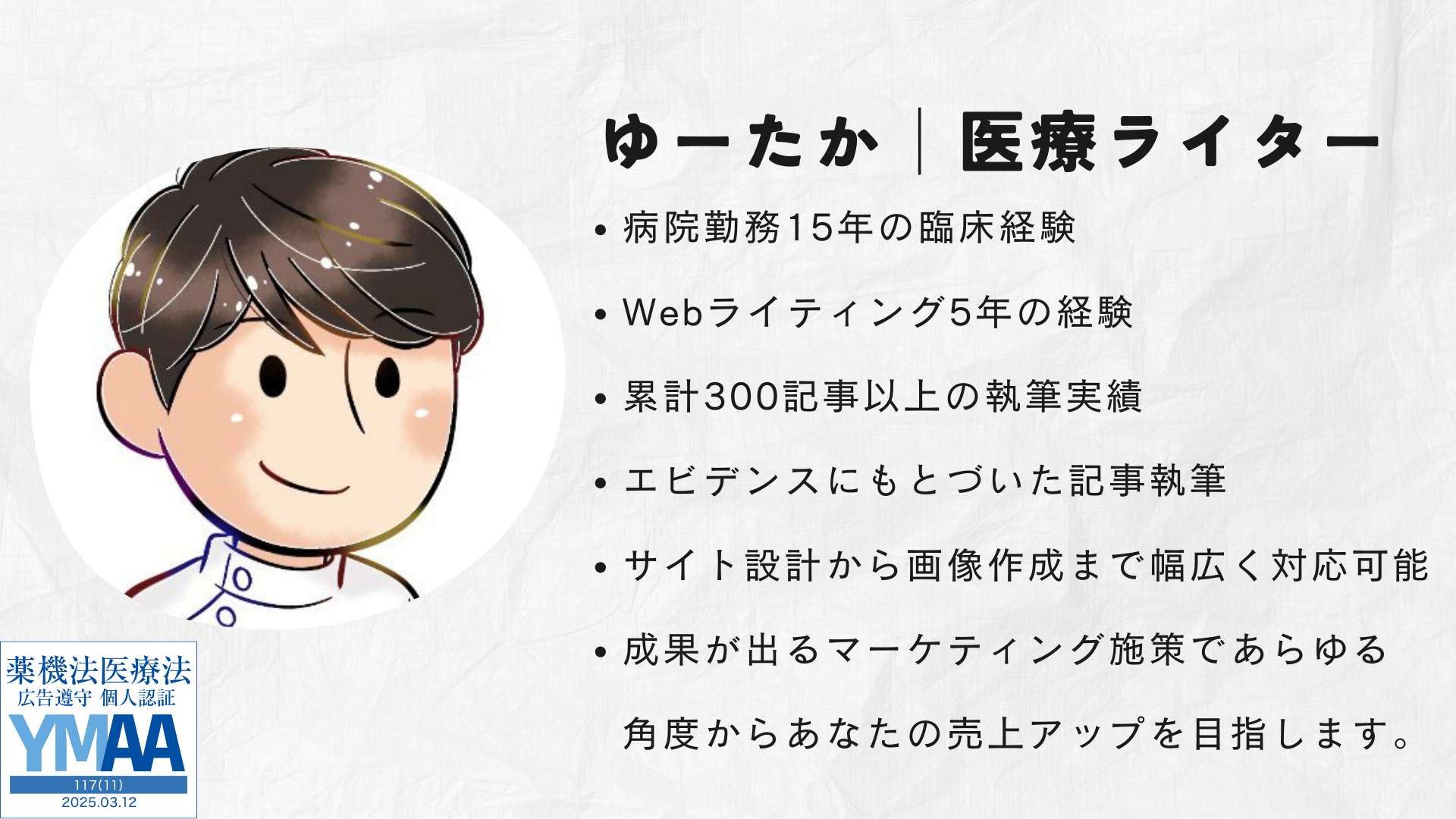 YMAA認証マーク(薬機法・医療法適法広告取扱個人認証)を取得しており、